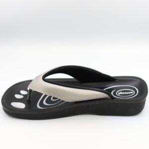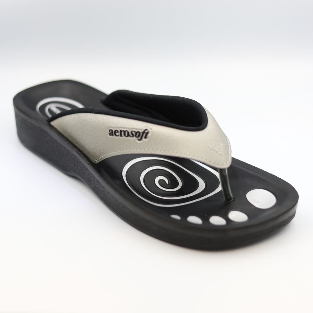 Step into ultimate comfort with the Black & Silver Comfort Slippers, designed for relaxation and everyday ease. These stylish slippers feature a soft black footbed adorned with a distinctive white spiral pattern and playful dot accents, offering a modern and cheerful vibe. The sleek silver-toned strap, bearing the “aerosoft” logo, provides a clean and contemporary contrast.