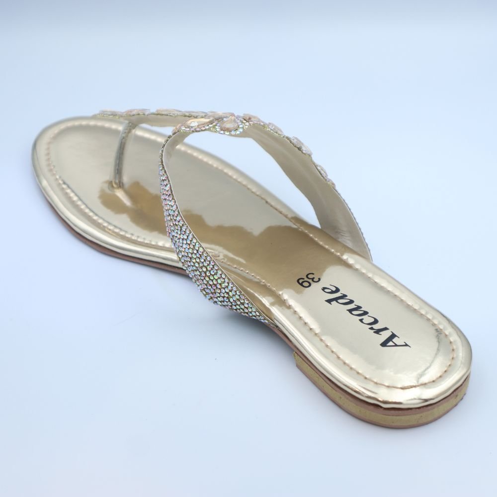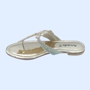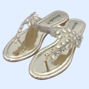 The distinctive toe-ring, also adorned with matching gold details, ensures a comfortable and secure fit while enhancing the sandal’s chic appeal. Set upon a stable wedge heel, these sandals provide comfortable elevation, making them ideal for extended wear during festive celebrations, elegant parties, weddings, or any special occasion in Dubai. The subtle sparkle along the sole adds an extra touch of refinement.