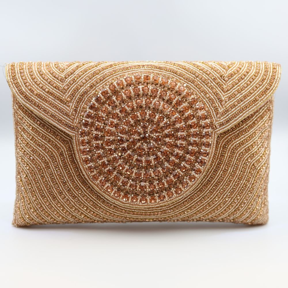 Illuminate your evening look with this breathtaking Golden Bronze Beaded Sunburst Envelope Clutch, a must-have accessory for any glamorous event in Dubai. This exquisite clutch is meticulously hand-embellished with an array of shimmering golden and bronze beads, forming a captivating sunburst motif at its center, radiating outwards with intricate linear patterns. The rich texture and brilliant sparkle of the beadwork create a truly luxurious statement piece.