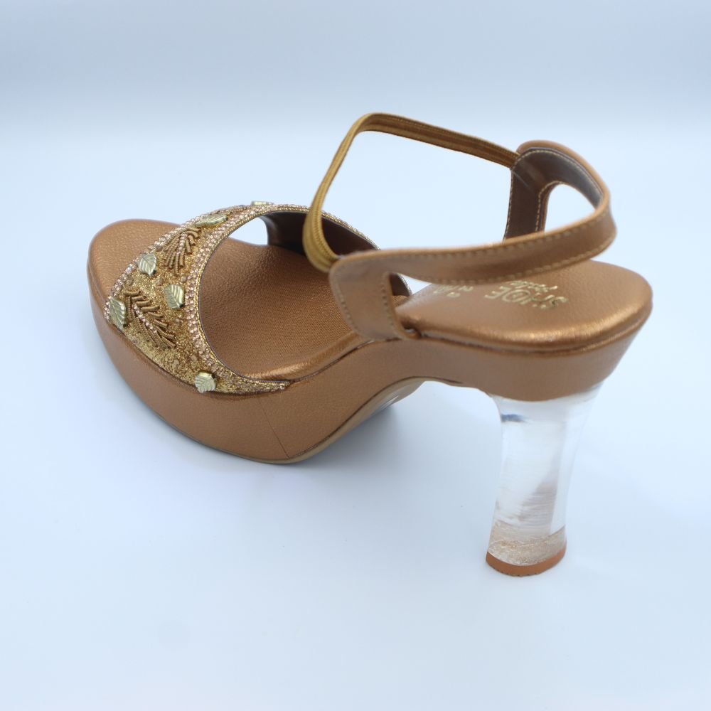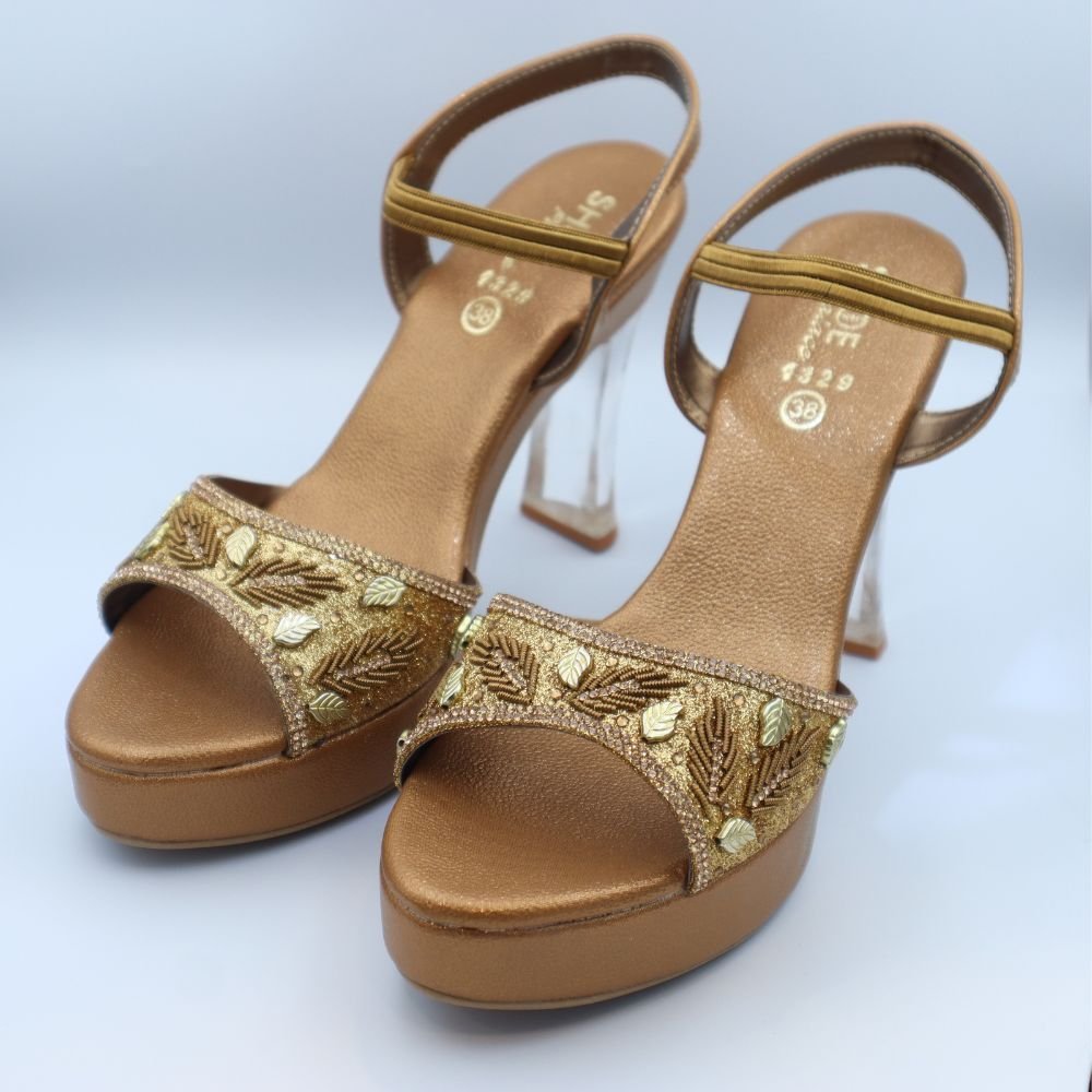 Step into ethnic elegance with these dazzling Golden Bronze Heeled Sandals, specially crafted to complement your festive and traditional outfits. Featuring a glamorous broad front strap embellished with shimmering beadwork and golden leaf motifs, these sandals exude both style and sophistication.