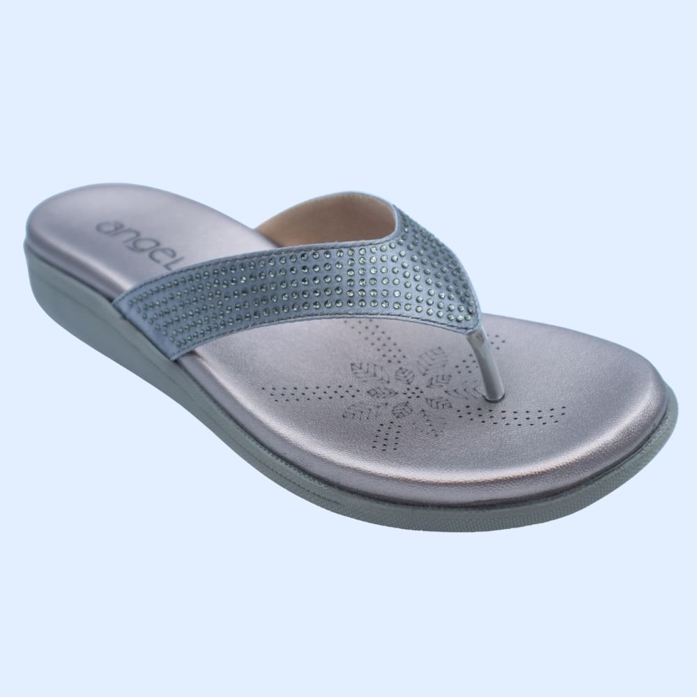Step into chic comfort with these stunning Gunmetal Grey Sandals. The wide straps are elegantly adorned with shimmering rhinestones, adding a touch of sparkle to this versatile pair. These sandals are designed for both style and comfort, featuring a soft, padded insole with a delicate floral pattern and ventilation holes for breathability.