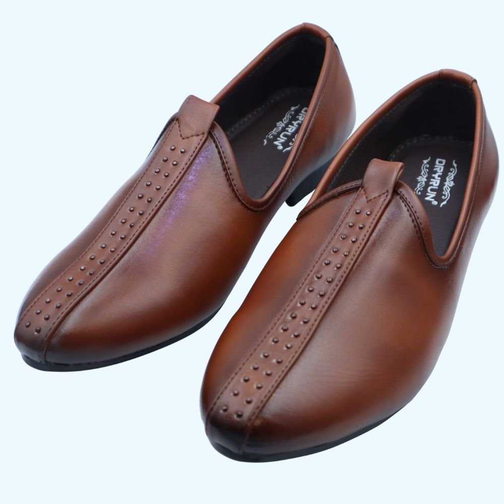 Embrace timeless tradition and comfortable style with these Men’s Classic Tan Leather Mojari Shoes, a versatile choice for cultural events, formal gatherings, and everyday elegance in Dubai. Crafted from high-quality genuine leather in a warm tan hue, these traditional Mojari shoes feature a classic silhouette with subtle raised detailing along the vamp, adding a touch of traditional charm. The comfortable slip-on design makes them easy to wear for any occasion.