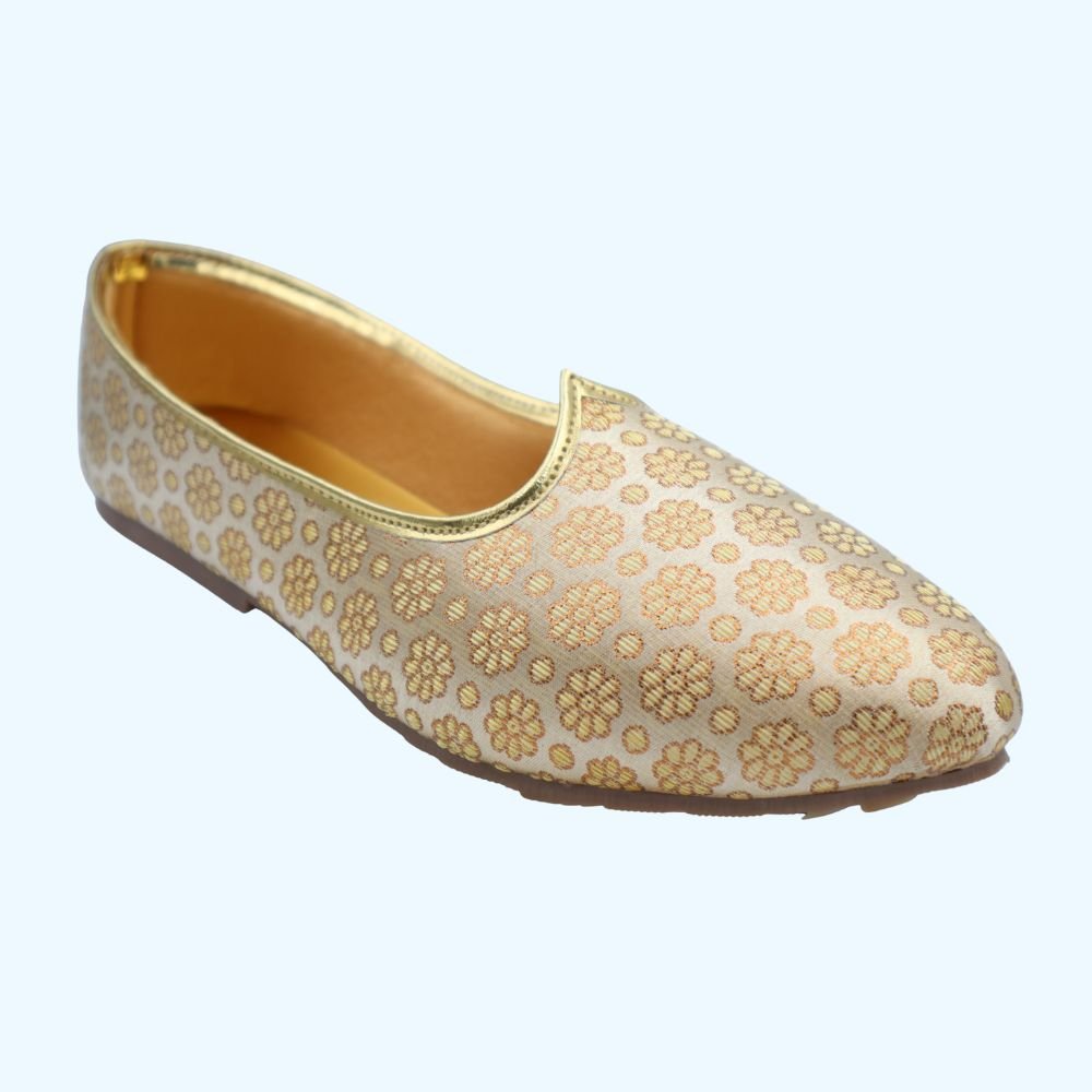 - Crafted from luxurious gold brocade fabric with intricate floral patterns