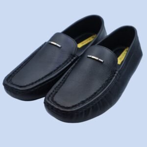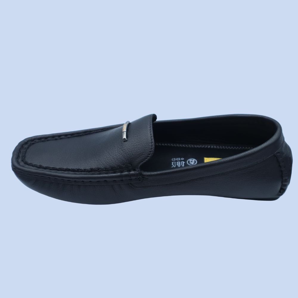 Step into effortless sophistication with these Men’s Sleek Black Leather Loafers, a modern and refined choice for the discerning gentleman in Dubai. Expertly crafted from smooth, high-quality black leather, these slip-on loafers feature a clean, streamlined design. A subtle yet distinctive silver-toned metal detail with a unique shape on the vamp adds a touch of contemporary flair, setting them apart. The thoughtfully designed, flexible sole ensures comfortable wear throughout your busy day in the city.