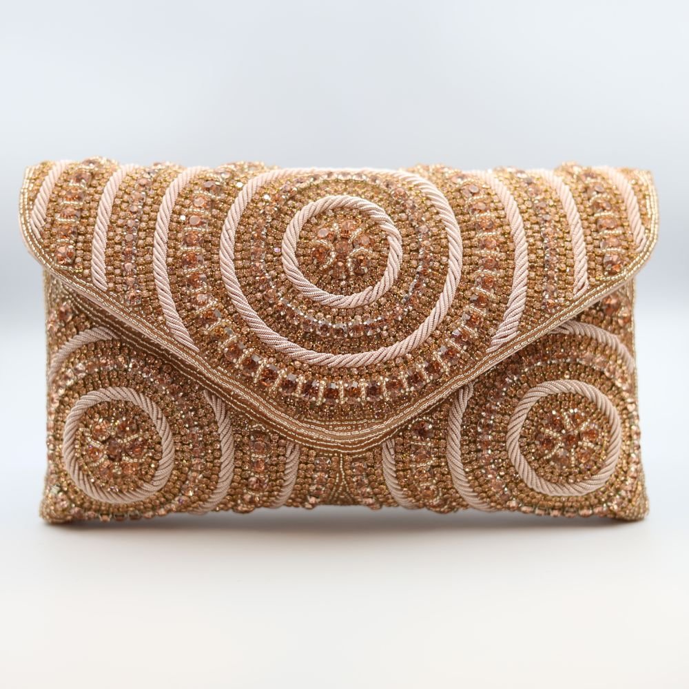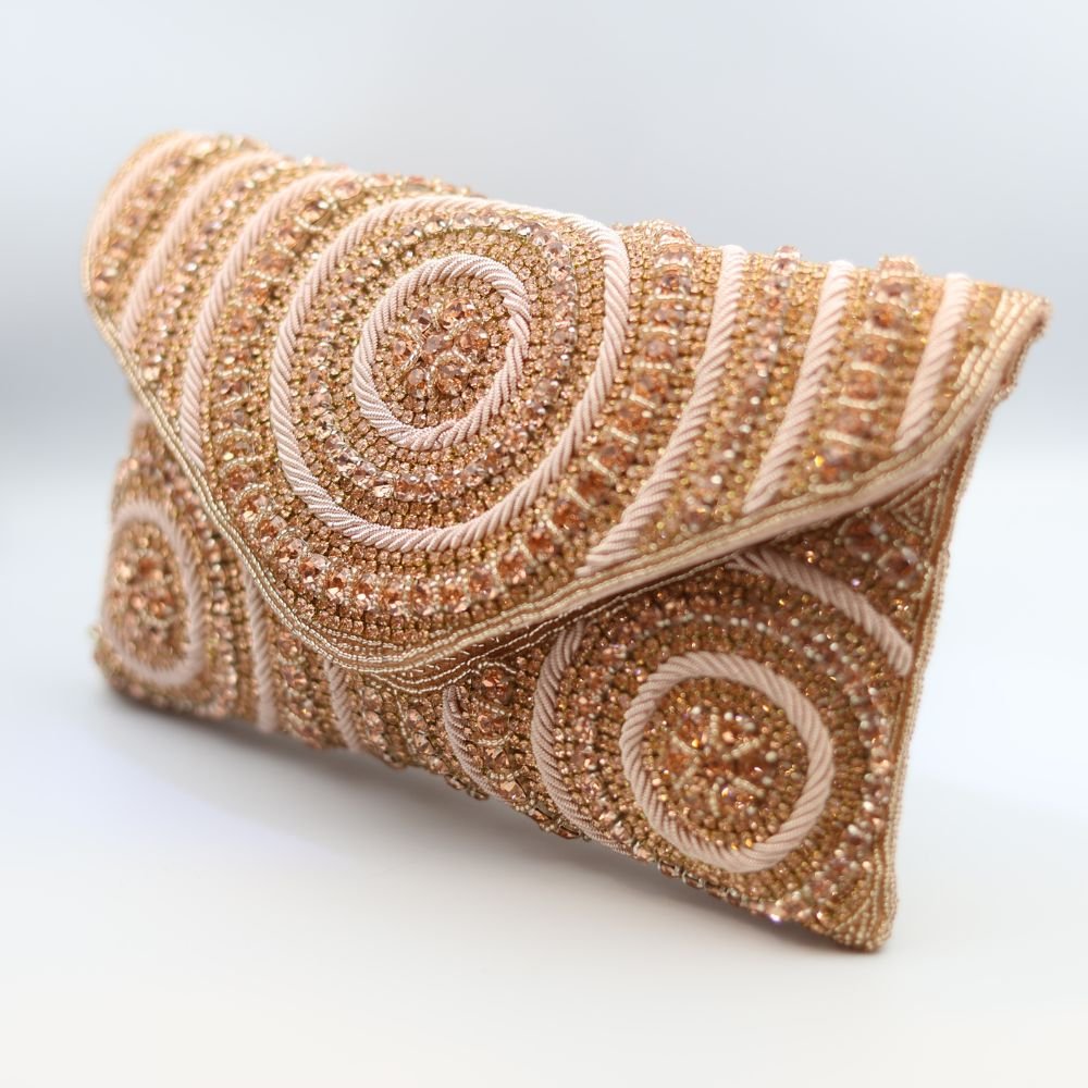 Make a sparkling statement with this exquisite Rose Gold Beaded Swirl Pattern Envelope Clutch, perfect for adding a touch of lavish elegance to your evening attire in Dubai. This stunning clutch is entirely hand-embellished with various shades of rose gold and champagne beads, forming intricate concentric circles and swirling patterns across its envelope-style flap and body. The rich texture and brilliant shimmer make it a true work of art.