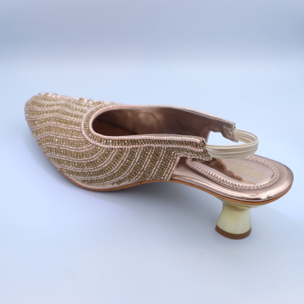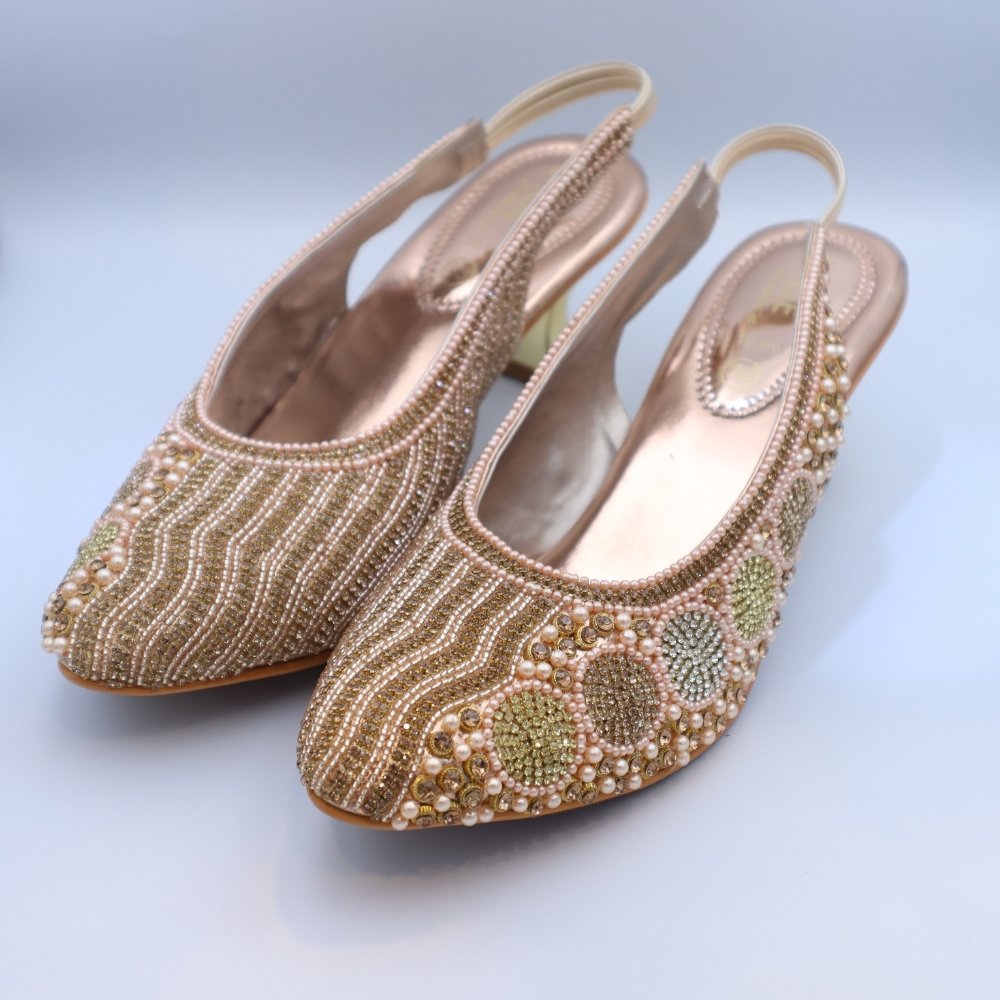 Step into enchanting elegance with these exquisite Rose Gold & Multi-Tone Sparkle Embellished Slingback Jutti Heels. Designed to cast a captivating glow, these closed-toe pumps are a celebration of intricate artistry. The delicate rose gold base is lavishly adorned with a symphony of luminous pearls, and dazzling crystals in varied shades of rose gold, champagne, and subtle silver, meticulously arranged in mesmerizing circular patterns and shimmering lines across the vamp and toe.