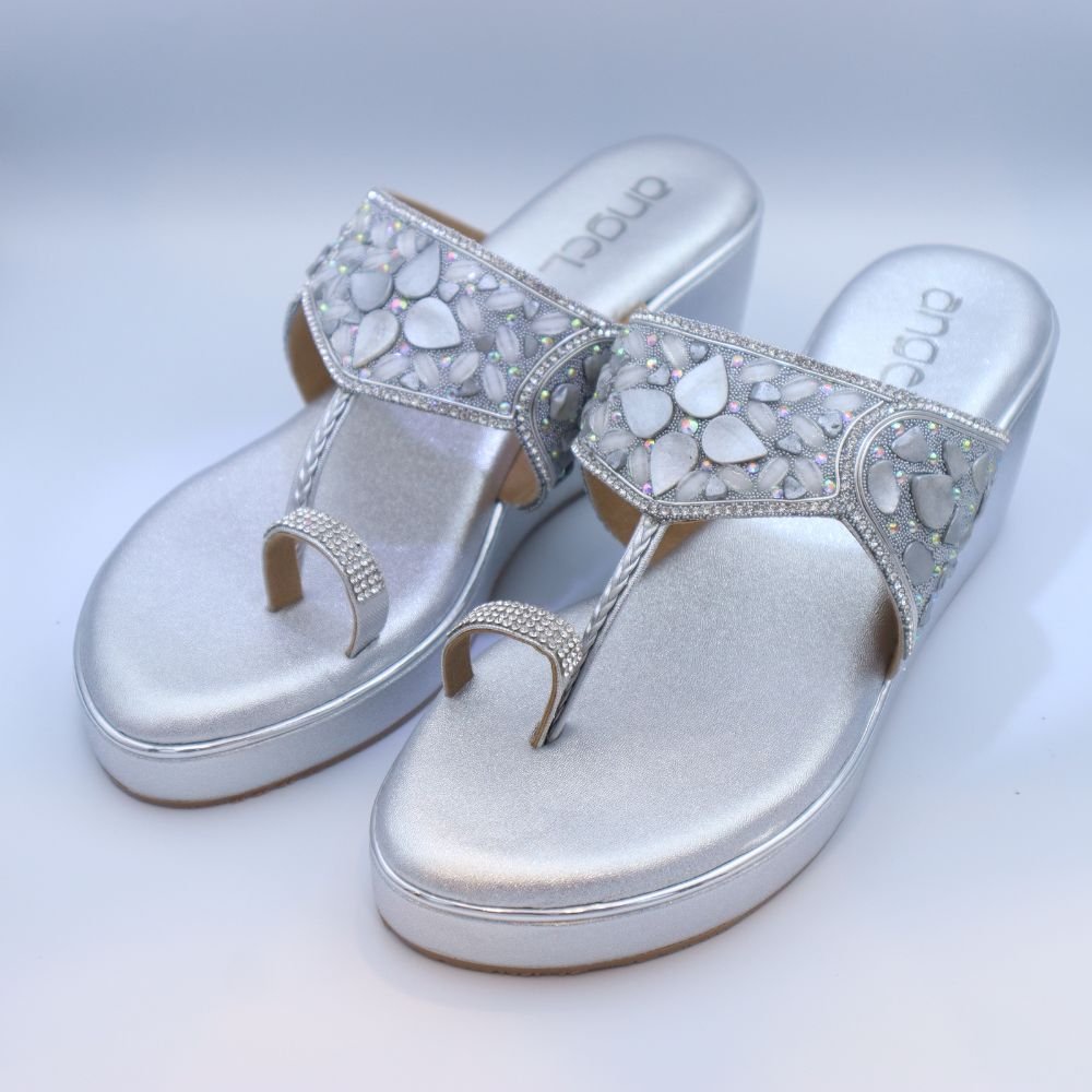 The slender toe-ring, also encrusted with shimmering crystals, ensures a secure and elegant fit. Set upon a comfortable and stable silver-toned wedge heel, these sandals provide a graceful lift without compromising on comfort, making them ideal for long hours of wear at special events or stylish gatherings in Dubai. The metallic sheen of the sole further enhances their luxurious appeal.