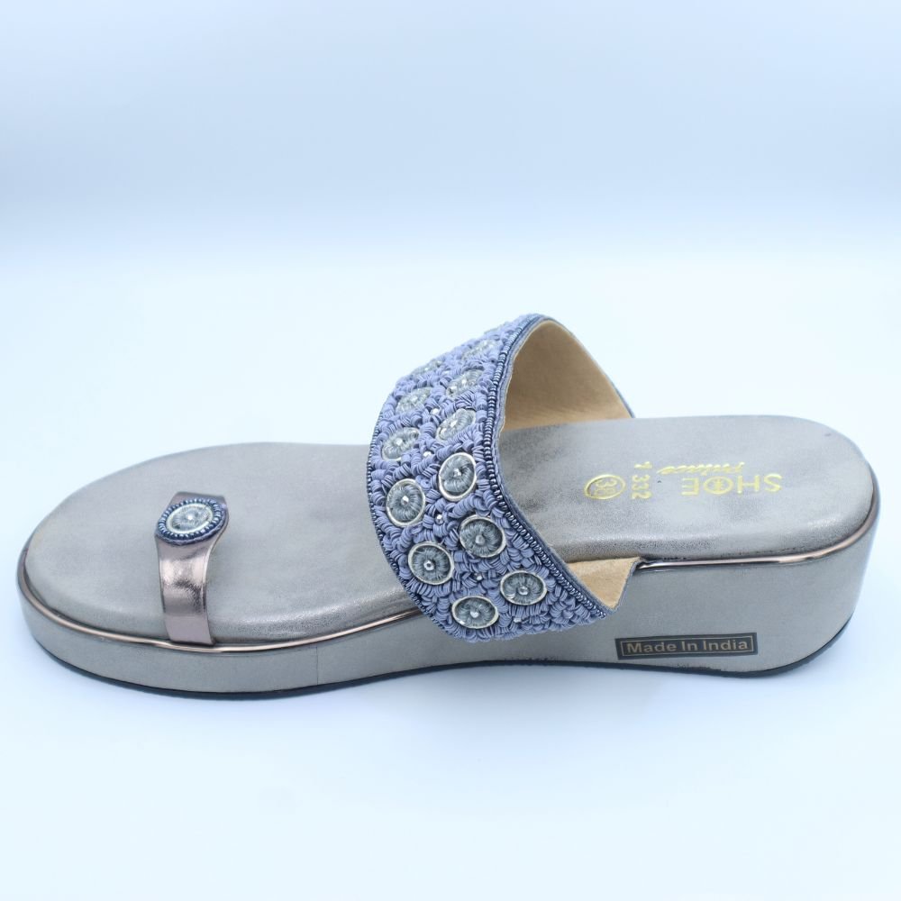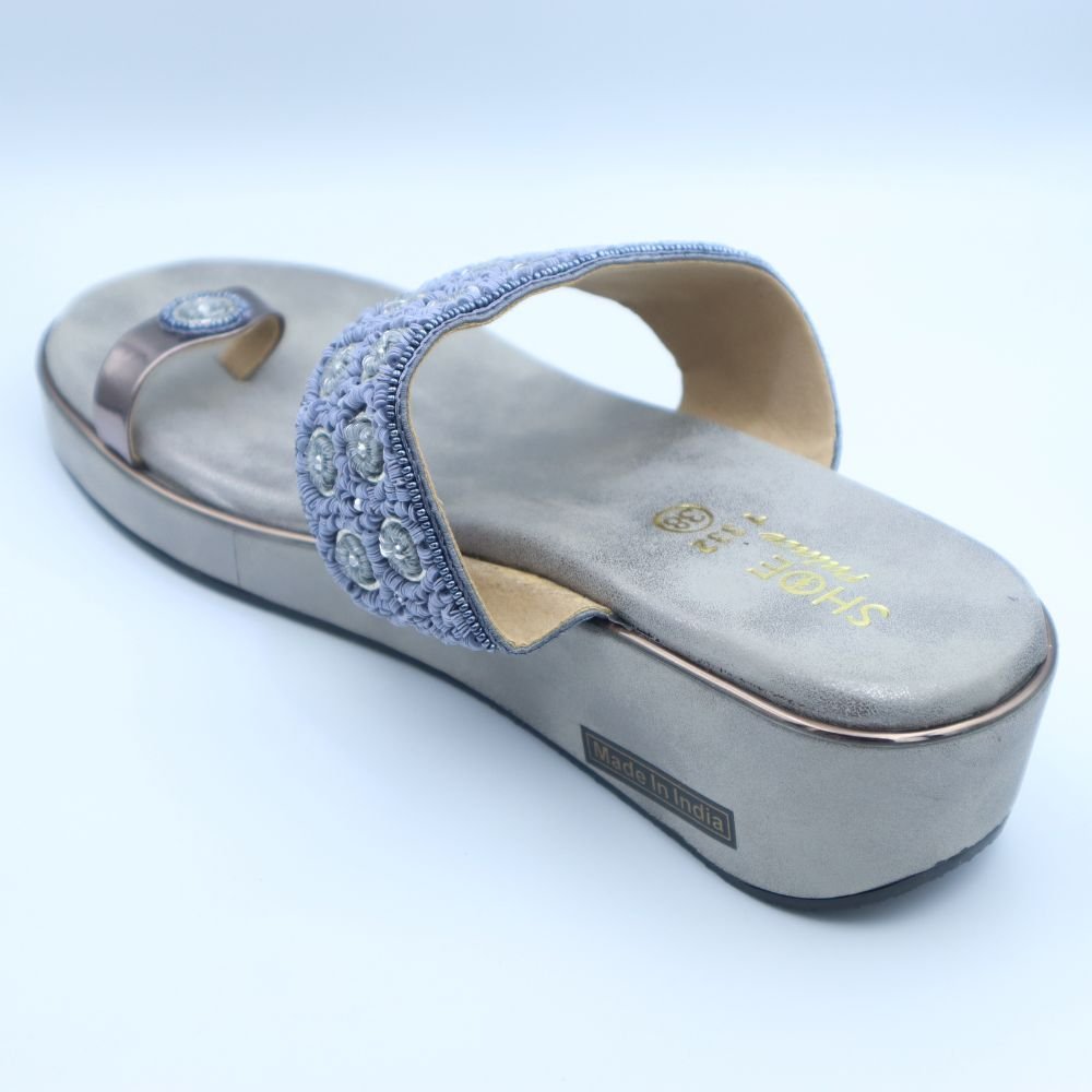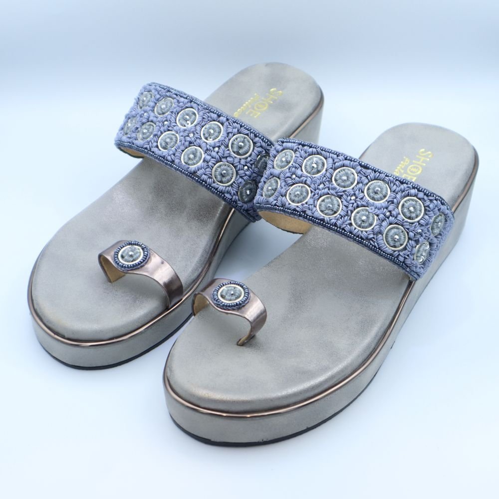 Add a touch of contemporary elegance to your footwear collection with these Silver Grey & Powder Blue Embroidered Wedge Toe-Ring Sandals. These chic sandals boast a broad strap in a sophisticated silver-grey hue, beautifully embellished with intricate powder blue (light blue) circular embroidery and delicate silver-toned beads.